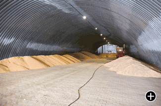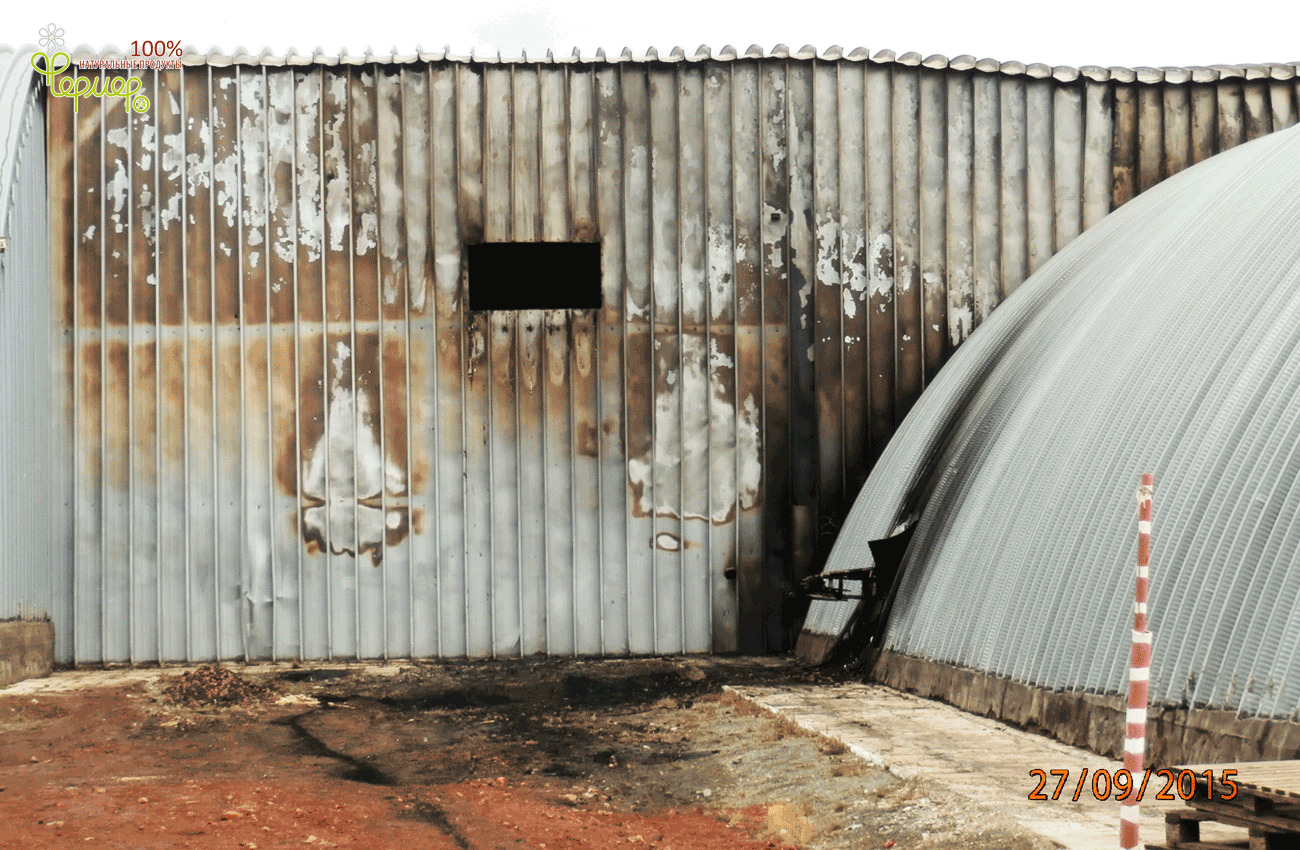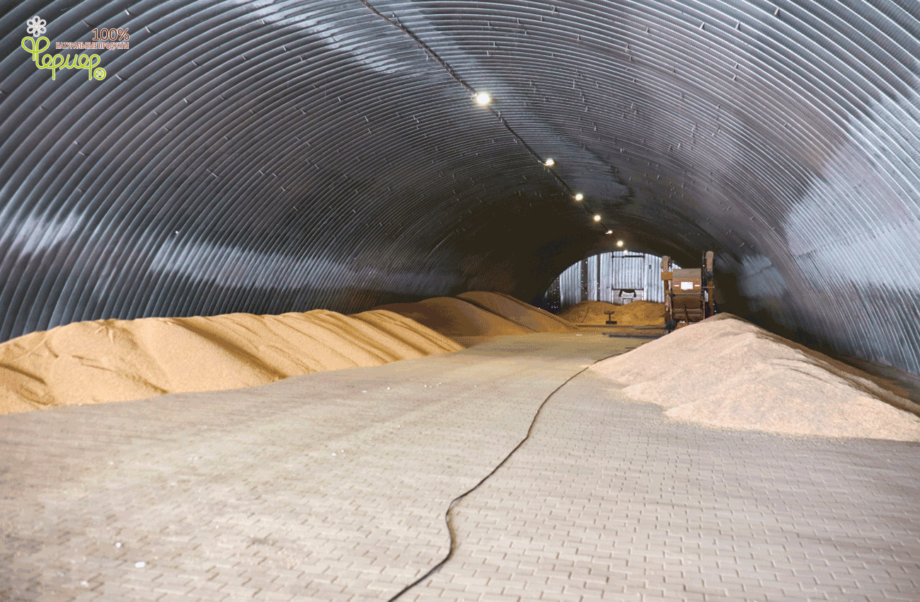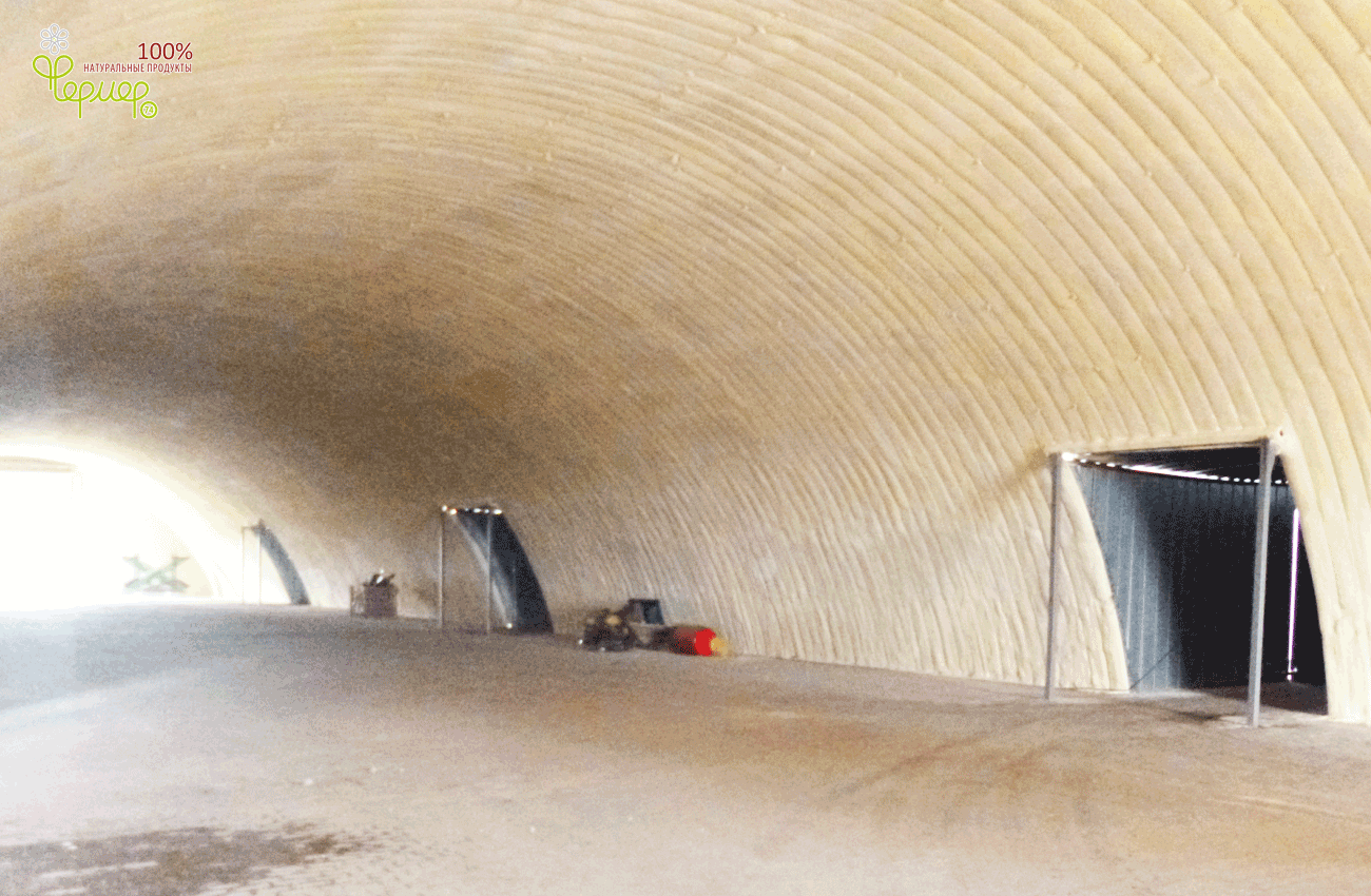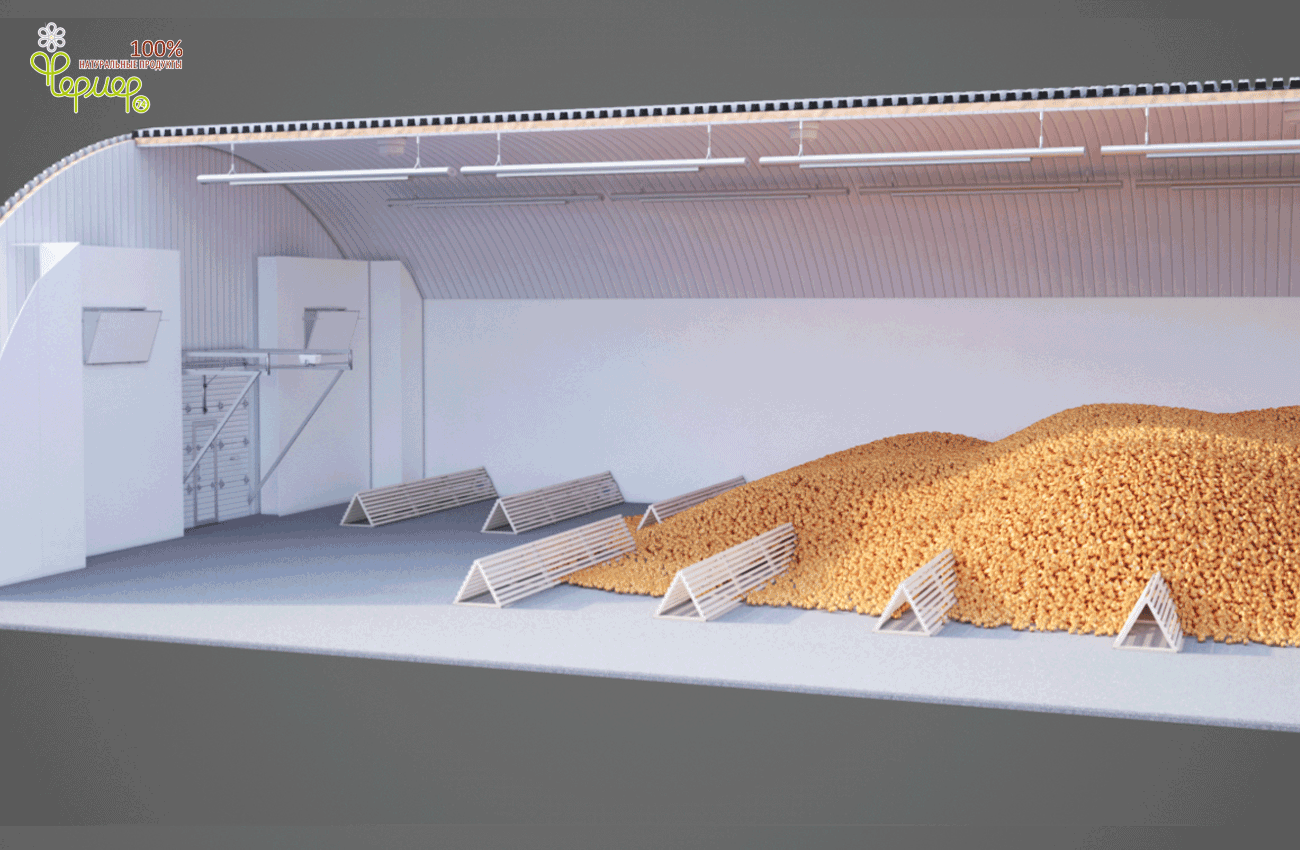 4. Хранилище позволяет хранить 2000т зерна навалом. В своей конструкции имеет вдоль стен бетонную стенку высотой 1,2 метра с термослоем, рассчитанную на опирание зерна на стенки зернохранилища.