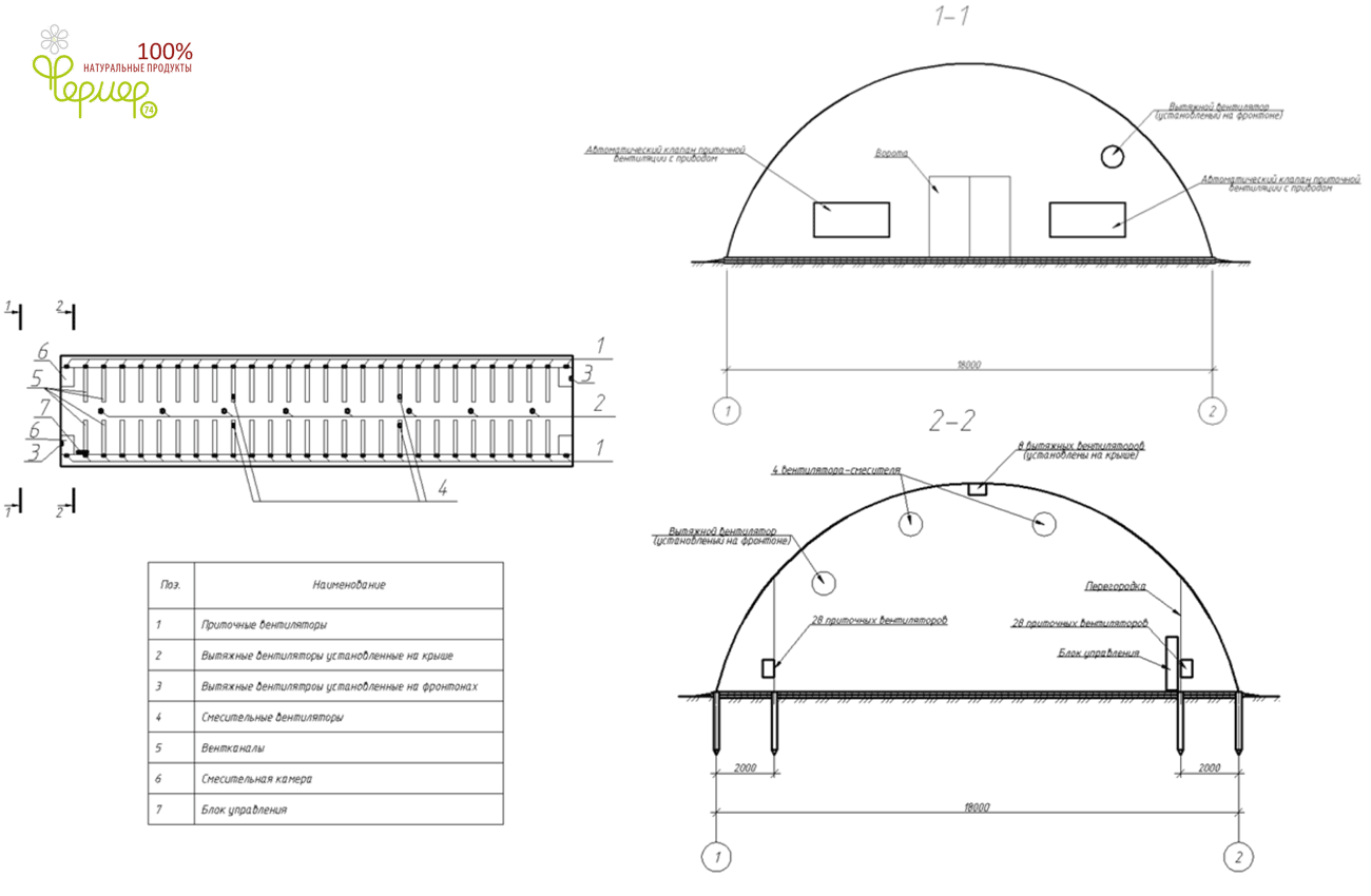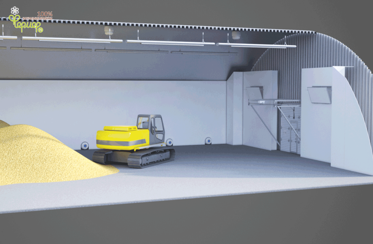 2. Данное техническое решение позволяет удобно принимать зерно с поля, хранить его и отгружать по мере надобности потребителям. В нем предусмотрено решение естественной экономичной регулируемой вентиляции, экономного освещения на диодных светильниках. По желанию заказчика могут быть установлены дополнительные светильники, подавляющие негативную микрофлору при хранении зерна.