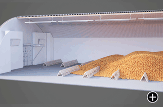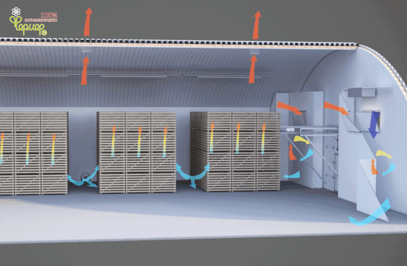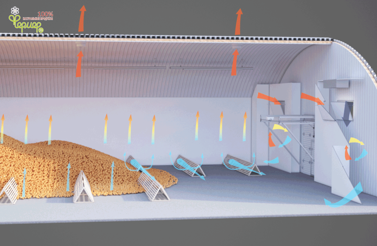 Из смесительной камеры через магистральные воздуховоды (напорные стенки), идущие вдоль хранилища, из которых воздух подается в раздающие напольные каналы. Проходя сквозь бурт, воздух постепенно нагревается, и часть воздуха выводится вытяжными вентиляторами, установленными в верхней точке ангара.