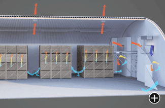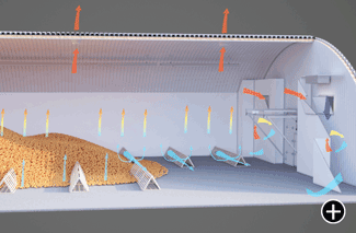 Аналогично буртовой схеме хранения нагретый воздух частично отводится с помощью вытяжных вентиляторов, а другая часть подмешивается с вновь поступившим свежим воздухом в смесительной камере. Получившаяся смесь контролируется автоматикой по показателям температуры и влажности и затем подается в магистральные каналы.